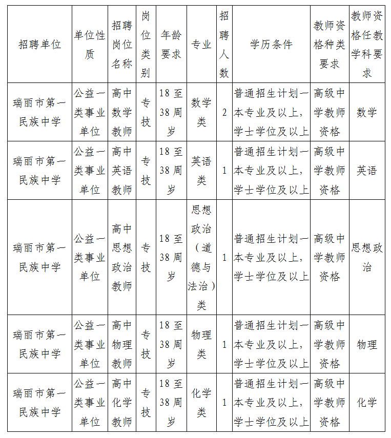 本次共招聘教師6名,具體招聘崗位及招聘條件,詳見《云南師范大學附屬瑞麗國門高級中學(瑞麗市第一民族中學)2026年招聘人員計劃表》。報名人員年齡在18周歲以上,38周歲以下。