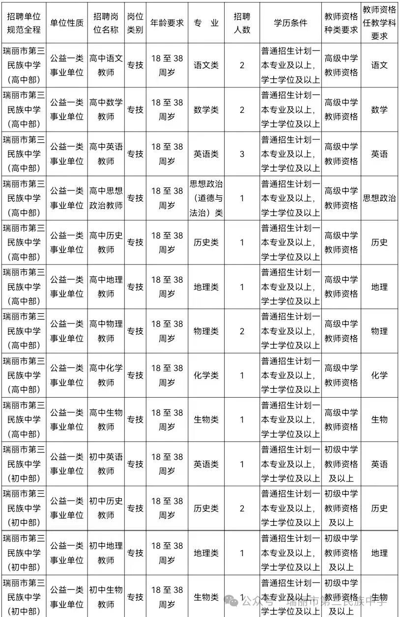 根據(jù)《德宏州人力資源和社會保障局關(guān)于印發(fā)2026年教育衛(wèi)生部門考核招聘緊缺專業(yè)學科優(yōu)秀人才工作方案的通知》(德人社發(fā)〔2025〕34號)、《瑞麗市教育體育系統(tǒng)2026年考核招聘緊缺專業(yè)學科優(yōu)秀人才工作方案》文件精神,2026年瑞麗市第三民族中學考核招聘緊缺專業(yè)學科優(yōu)秀人才19名,現(xiàn)將有關(guān)事宜公告如下: