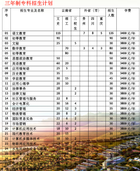 學校位于云南省德宏州州府芒市,前臨國家AAAA級風景名勝區勐巴娜西珍奇園,背靠東南亞最大的勐煥大金塔和美麗的孔雀湖,交通便利,氣候宜人,花開四季,生活尤為方便。學校現階段在老校區辦學,新校區占地997畝,總建筑面積36萬平方米,總投資14.5億元,一期工程投資6億多元,預計2015年8月31日竣工驗收,2016年1月可整體搬遷進入新校區辦學。現有11個教學系部,共有教職工415人,其中專任教師332人,專任教師中教授19人,副教授92人,省級教學名師3人,博士研究生5人,碩士研究生194人;全日制在校生近6000人。開設教師教育類、高職類共55個專業,有校內實驗室42個,校內實訓場所80個,校外實習基地107個,校外實訓基地83個,其中,省級校內示范實訓基地1個,省級校外示范實訓基地2個。學校現有科研儀器設備總值3232萬余元,有紙質圖書62.86萬冊。