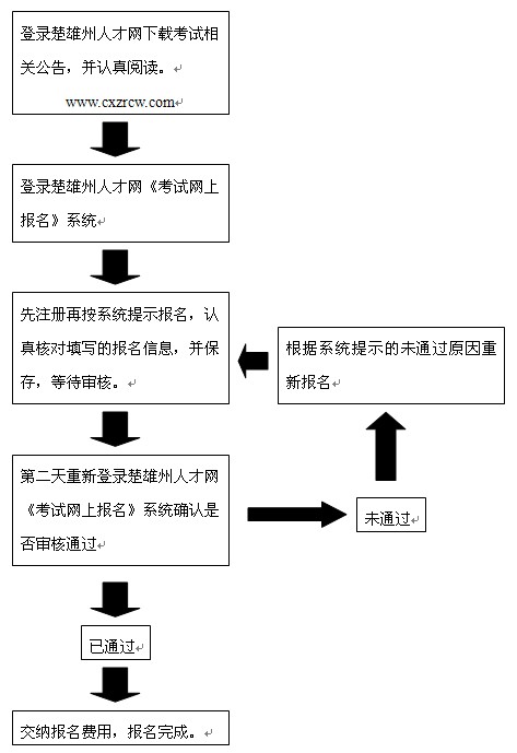 考生登錄楚雄州人才網《考試網上報名》系統先注冊再按系統提示報名,成功報名后第二天重新登錄楚雄州人才網《考試網上報名》系統確認是否審核通過,未通過者根據系統提示的未通過原因重新報名;網上報名審核將采取系統自動審核與人工審核相結合,先由報名系統對考生的“性別、民族、年齡、學歷、學歷類型、畢業年份”等6項信息對照招聘崗位條件進行系統自動審核,符合崗位條件審核通過的考生,再由工作人員對考生的“照片、生源地、專業、崗位其它條件”等信息對照招聘崗位條件進行人工審核。網報不進行相關證書證件原件的審查,考生應對所填信息的真實性負責,若存在弄虛作假行為,對隱瞞真實情況不符合報名資格的考生,取消其考試或錄用資格,造成的后果由考生承擔。
