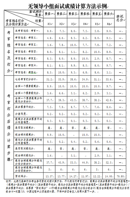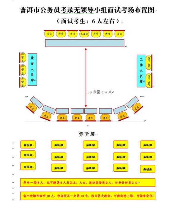 (3)每個(gè)面試考場人員安排為考官7人(主考官1人,其他考官6人,面試考場成立面試考官小組,主考官為面試考官小組組長),計(jì)分2人,引導(dǎo)員1人,人大監(jiān)督員1人,政協(xié)監(jiān)督員1人,考生一般每個(gè)考場每輪8人左右,設(shè)旁聽席位10個(gè)。