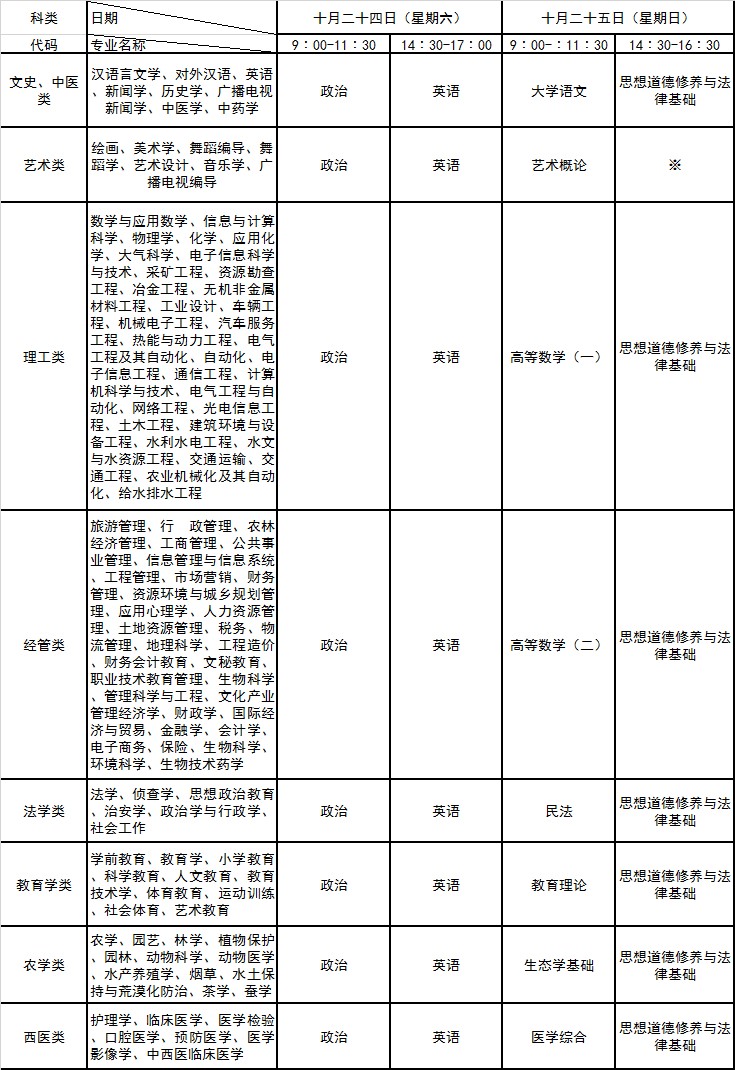 2.藝術類考試科目為:政治、英語、藝術概論、專業課由學校自行組織考試;