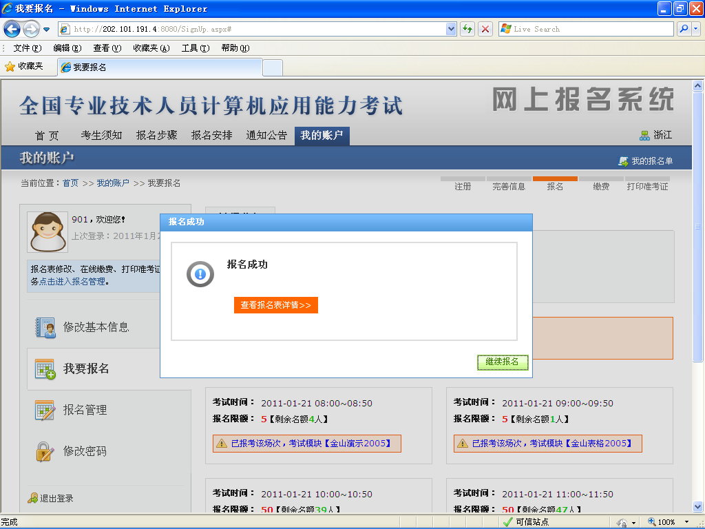 選擇考試模塊,點擊“立即報名”即可實現報名。報名成功后會出現如下圖所示界面: