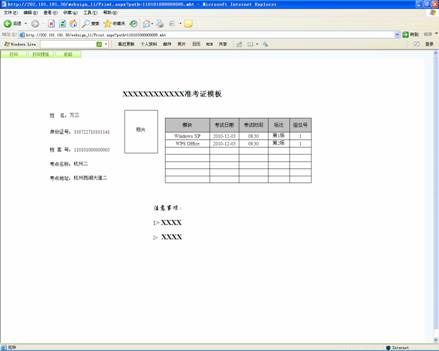 若存在滿足條件的數據(若是按場次報名,則繳費后即可打印;若是按時間段報名則必須批量報名分配完成后且是規定的打印準考證時間后才能打印),點擊“打印準考證”進入打印準考證界面,如下圖: