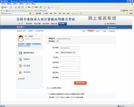 設置電子郵箱、學歷、工作單位、電話號碼、手機號碼、通訊地址、郵政編碼等,然后點擊“保存基本信息”按鈕,實現基本資料的設置。在正式報名前,這些資料必須完備,否則不允許進行報名。