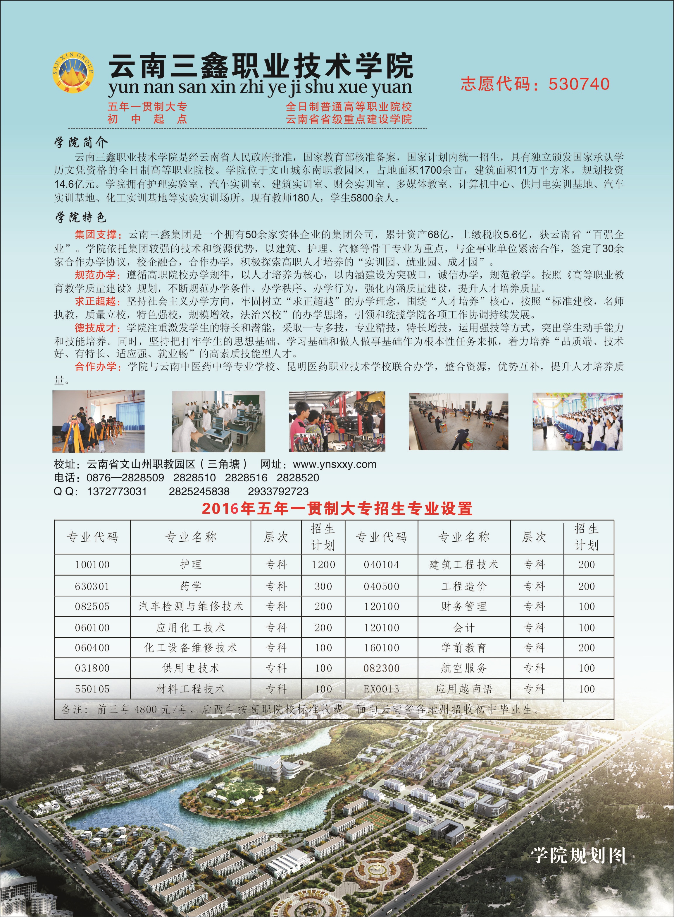 云南三鑫職業技術學院2016年五年大專填報志愿指南