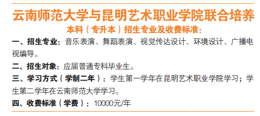 根據云南省招生考試院有關文件的規定,結合實際情況,2016年云南師范大學繼續面向全省高等專科學校招收優秀應屆專科畢業生,其中,與昆明藝術職業學院聯合培養招生專業如下: