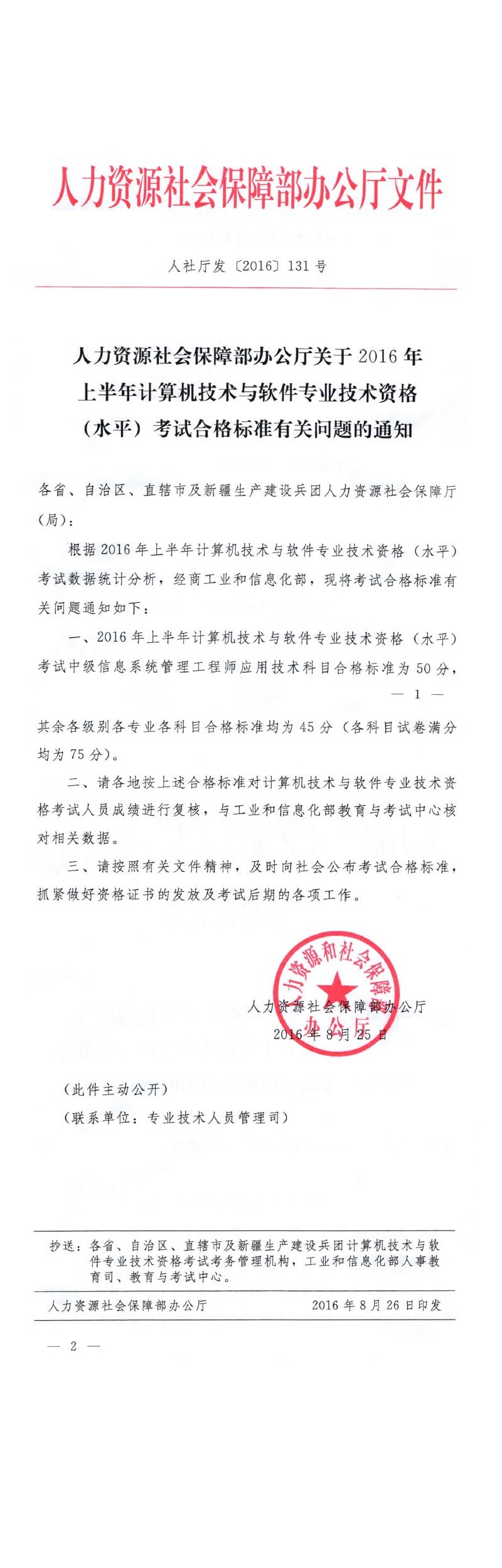 人力資源社會保障部辦公廳關(guān)于2016年上半年計算機技術(shù) 與軟件專業(yè)技術(shù)資格(水平)考試合格標準有關(guān)問題的通知
