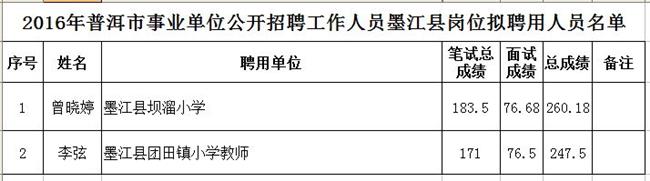 根據《2016年普洱市事業單位公開招聘工作人員公告》要求,2016年普洱市事業單位公開招聘工作人員墨江縣崗位筆試、專業知識面試、體檢、考核等工作已結束,現將擬聘用人員名單和有關事項公告如下: