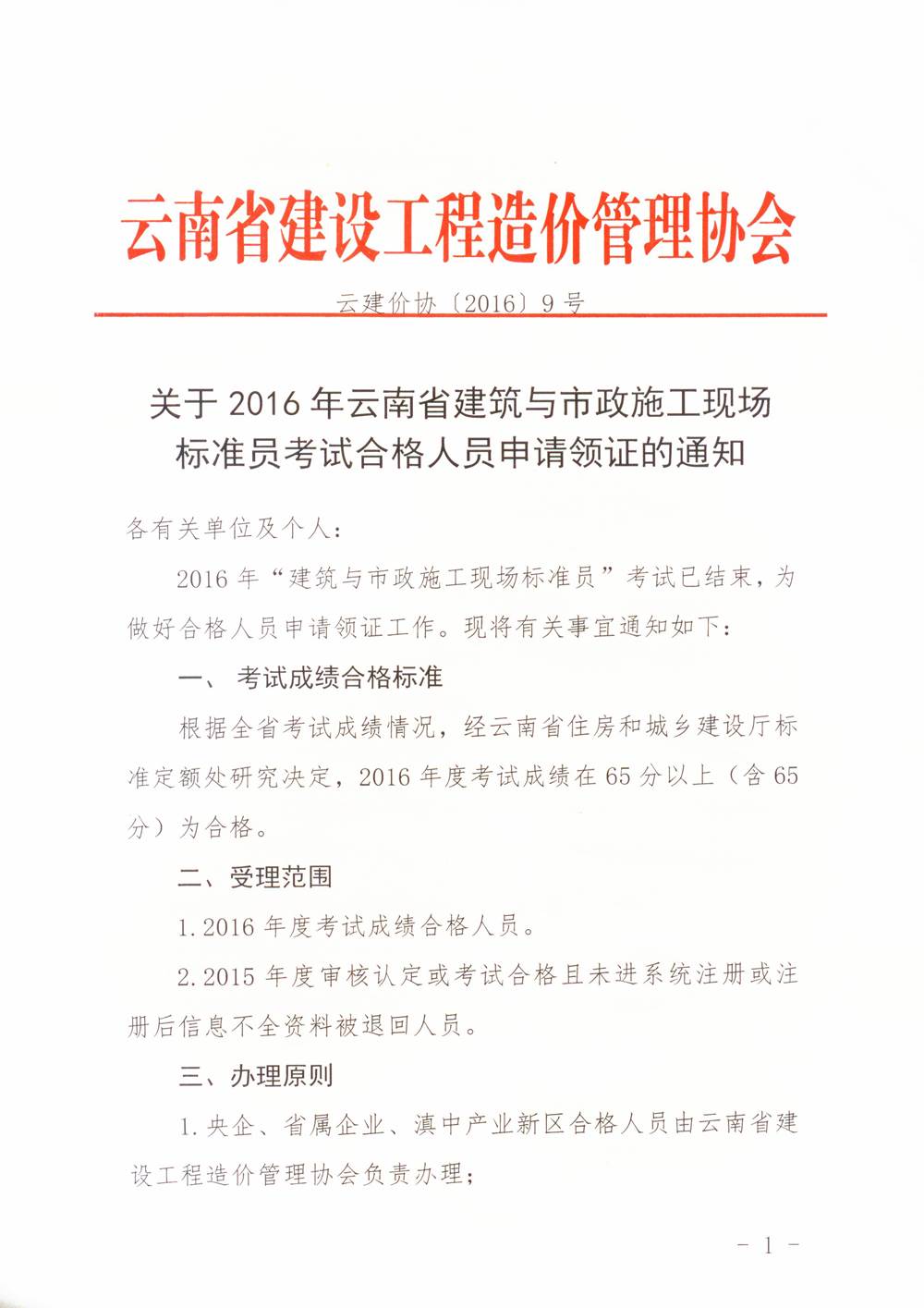 2016年云南省建筑與市政施工現場標準員考試合格申請領證通知