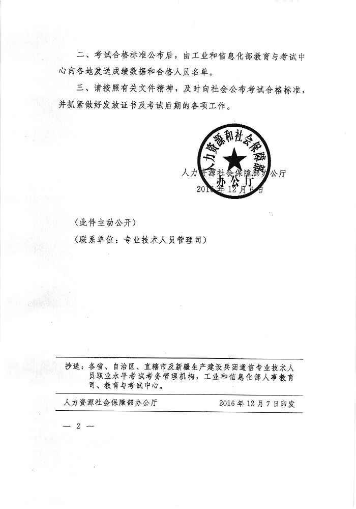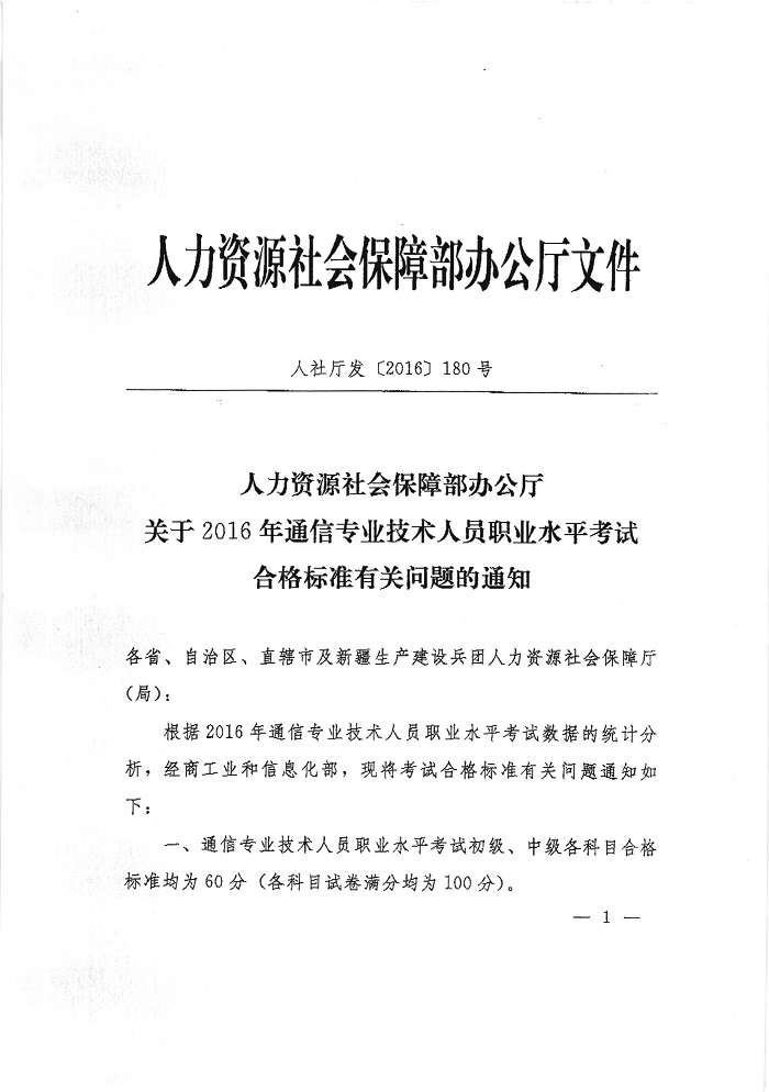 人社部關于2016年通信專業技術人員 職業水平考試合格標準有關問題的通知