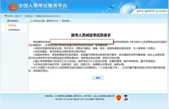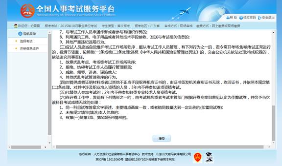 點擊“接受”按鈕,進入查看考生承諾書的頁面,如下圖所示:
