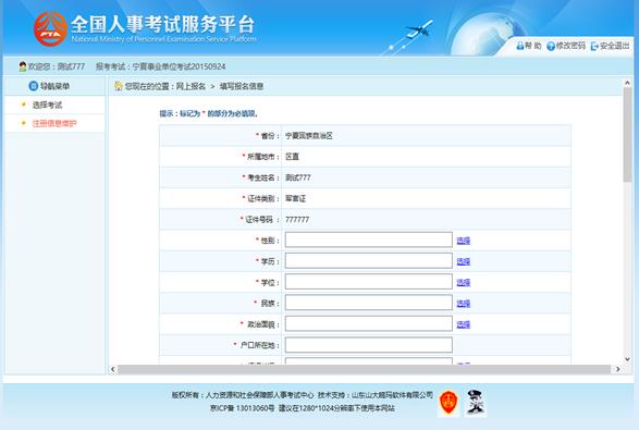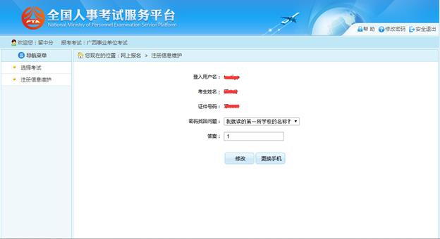 通過點擊系統(tǒng)導航菜單中“注冊信息維護”選項,可跳轉(zhuǎn)到修改注冊信息頁面,其中用戶名、證件號碼和姓名等考生關(guān)鍵信息不允許進行修改,如下圖所示: