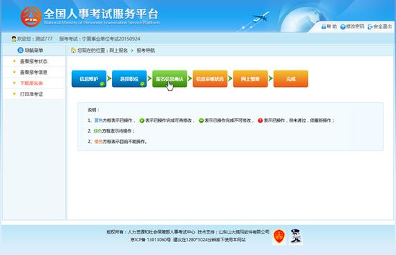 通過點擊“確認”按鈕,提示確認成功后跳轉(zhuǎn)到報考流程頁面,則完成填報信息操作。如下圖所示: