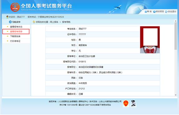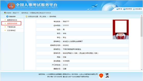 點擊系統(tǒng)導航菜單的“查看報考信息”選項,可進入查看考生報考信息的頁面,如下圖所示: