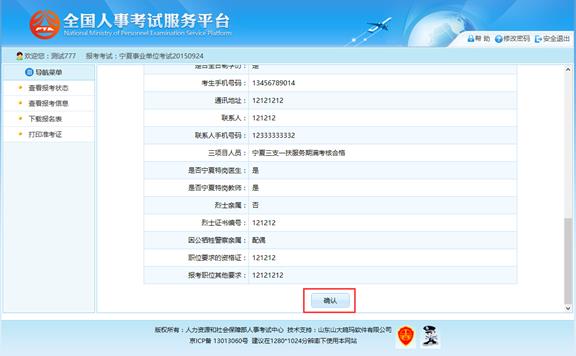 點擊“報名信息確認”按鈕后,跳轉(zhuǎn)到報名信息確認頁面,如下圖所示: