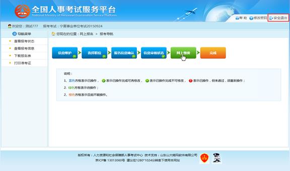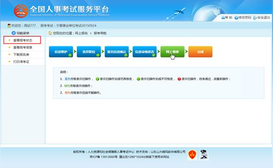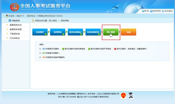 通過審核的考生可以進行網(wǎng)上繳費,點擊報考流程中“網(wǎng)上繳費”選項,可以進入網(wǎng)上繳費的頁面,如下圖所示: