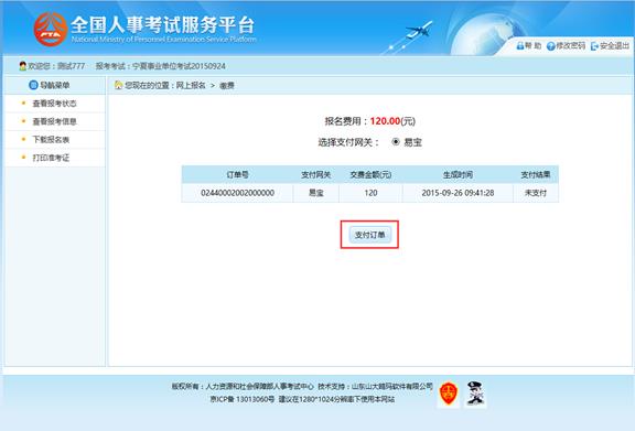 考生可以根據(jù)自己的情況選擇支付的網(wǎng)關(guān),選擇完成后點擊“生成訂單”按鈕,可以生成訂單,如下圖所示: