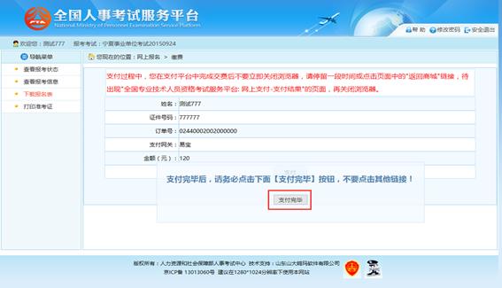 訂單確認無誤后,點擊“支付”按鈕,成功后再點擊“支付完畢”按鈕完成網(wǎng)上支付操作,如下圖所示:
