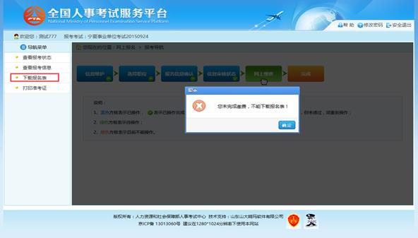 點擊系統(tǒng)導航菜單的“下載報名表”選項,可以下載考生信息表;下載考生信息表操作必須在考生完成繳費之后才能進行,如果考生未完成繳費點擊“下載報名表”菜單,系統(tǒng)會提示“您未完成繳費,不能下載報名表”。如下圖所示:
