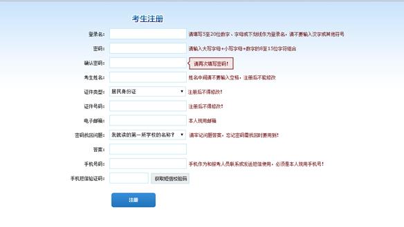 點擊“注冊”按鈕,進入考生注冊頁面,如下圖所示: