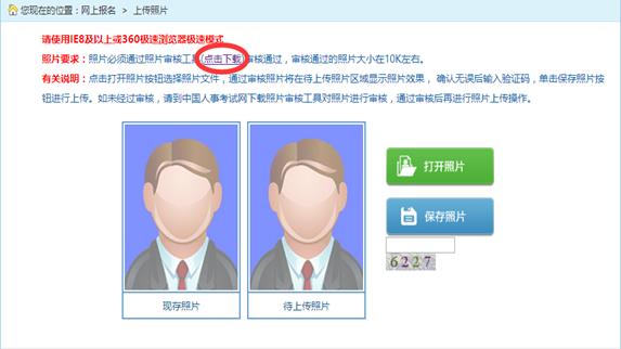 系統(tǒng)只能上傳通過中國人事考試網(wǎng)發(fā)布的照片審核處理工具(http://www.cpta.com.cn/n/2014/0611/c385858-25135705.html)處理后的照片,點擊“打開照片”按鈕選擇要上傳的照片,輸入驗證碼,點擊“保存照片”,上傳成功后跳轉(zhuǎn)到照片確認頁面,如下圖所示: