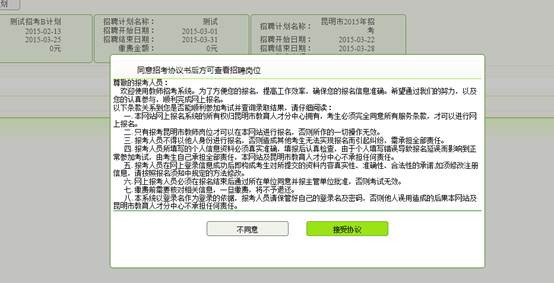 5、點擊報名之后,可以查看招考計劃的具體信息,如果要查看該招考計劃的崗位信息并進行報名,請點擊相應的招考計劃。此時請認真查看同意招考協議書條款,同意該協議書之后方能查看招考崗位信息。