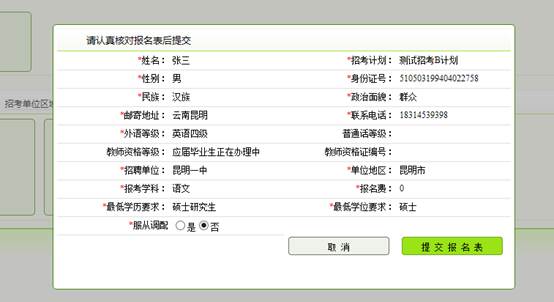 7、點擊報名,會彈出確認報名信息的顯示框,請最后確認要報名的崗位信息和個人資料信息,發現個人資料不對的地方,需要到資料維護里邊進行修改。特別說明:一個招考計劃下只能報一個崗位。