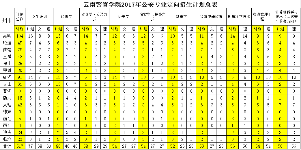云南警官學院2017年公安專業定向招生計劃總表