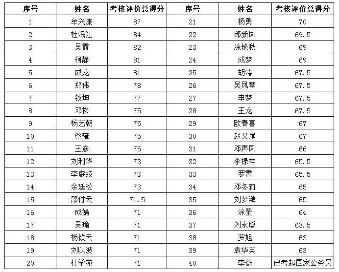 根據市委組織部《關于做好從優秀村(社區)干部中考試錄用鄉鎮(街道)公務員考核評價工作的通知(昭組通〔2017〕36號)要求,對報考鄉鎮(街道)公務員的大學生村官在面試前需進行考核評價。我縣嚴格按照《云南省從優秀村(社區)干部中考試錄用鄉鎮(街道)公務員考核評價評分標準》對大學生村官進行了量化評分,現將考核評價分數進行公示,公示時間為5天,如有疑問,請向縣委組織部大學生村官管理股反映。
