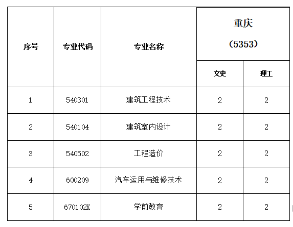云南城市建設職業學院2018年高職(專科)重慶分專業計劃表 填報志愿代碼5353