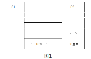 場地器材:10米長的直線跑道若干,在跑道的兩端線(S1和S2)外30厘米處各劃一條線(圖1)。木塊(5厘米×10厘米)每道3塊,其中2塊放在S2線外的橫線上,一塊放在S1線外的橫線上。秒表若干塊,使用前應(yīng)進(jìn)行校正。