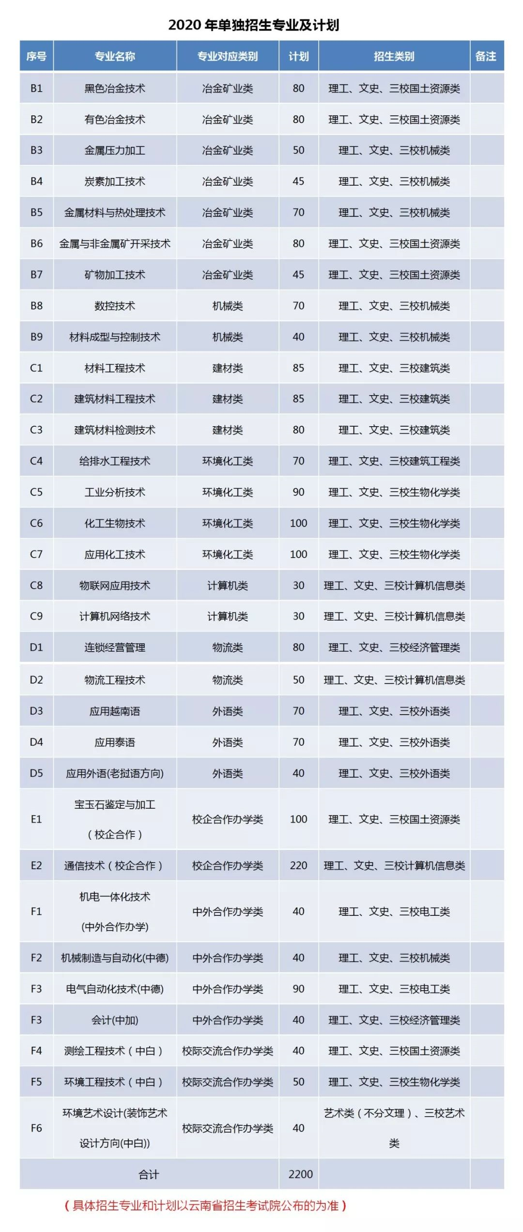 昆明冶金高等??茖W校2020年單獨招生簡章