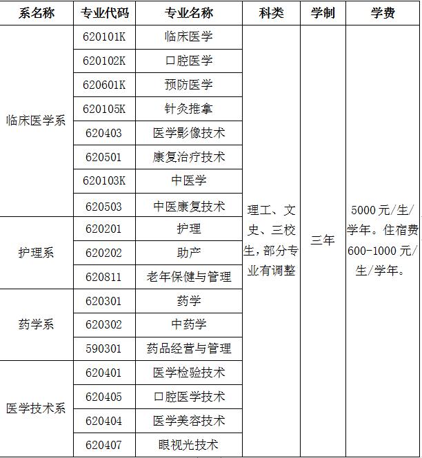 學(xué)院與省內(nèi)外100家醫(yī)院和醫(yī)藥衛(wèi)生機(jī)構(gòu)建立了校外教學(xué)基地,其中附屬醫(yī)院1所、非直屬附屬醫(yī)院2所、教學(xué)醫(yī)院15所,25所實(shí)習(xí)醫(yī)院。現(xiàn)開設(shè)有臨床醫(yī)學(xué)、口腔醫(yī)學(xué)、預(yù)防醫(yī)學(xué)、中醫(yī)學(xué)、針灸推拿、護(hù)理、助產(chǎn)、藥學(xué)、中藥學(xué)、醫(yī)學(xué)檢驗(yàn)技術(shù)、醫(yī)學(xué)影像技術(shù)、康復(fù)治療技術(shù)、眼視光技術(shù)、口腔醫(yī)學(xué)技術(shù)、中醫(yī)康復(fù)技術(shù)、藥品經(jīng)營(yíng)與管理、老年保健與管理、醫(yī)學(xué)美容技術(shù)18個(gè)大專專業(yè)。