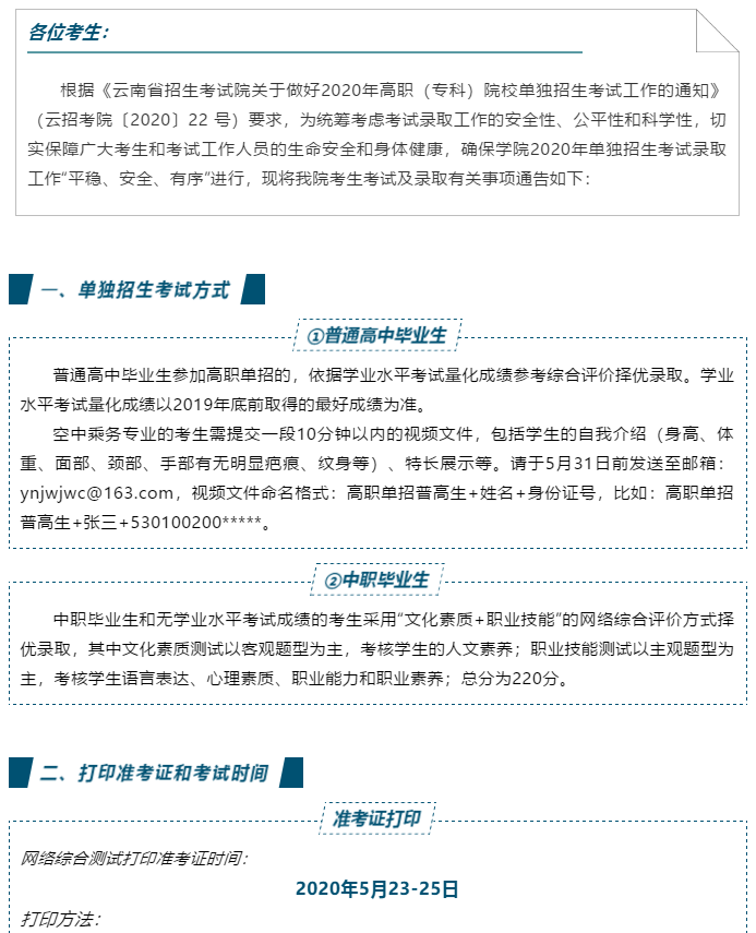 云南經貿外事職業學院 2020年單獨招生考試說明