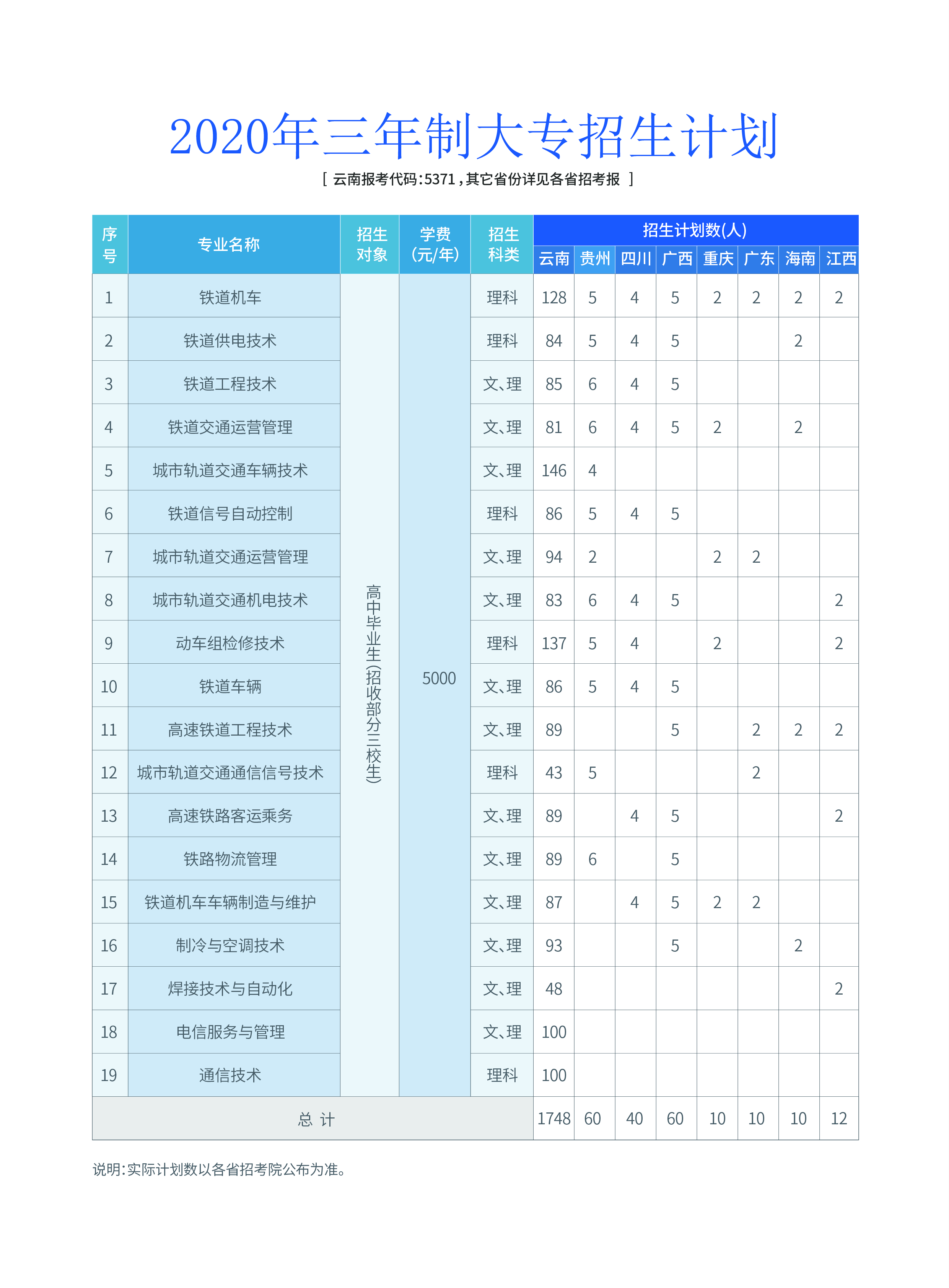昆明鐵道職業技術學院2020年招生計劃及報考須知
