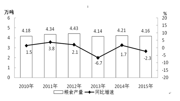例題:某市2015年全年糧食總產量4.16萬噸,同比下降2.3%;甘蔗產量0.57萬噸,下降23.6%;油料產量0.12萬噸,增長32.4%;蔬菜產量15.79萬噸,下降3.4%;水果產量7.84萬噸,增長7.4%。