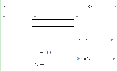 場地器材:10米長的直線跑道若干,在跑道的兩端線(S1和S2)外30厘米處各劃一條線(圖1)。木塊(5厘米×10厘米)每道3塊,其中2塊放在S2線外的橫線上,一塊放在S1線外的橫線上。秒表若干塊,使用前應進行校正。