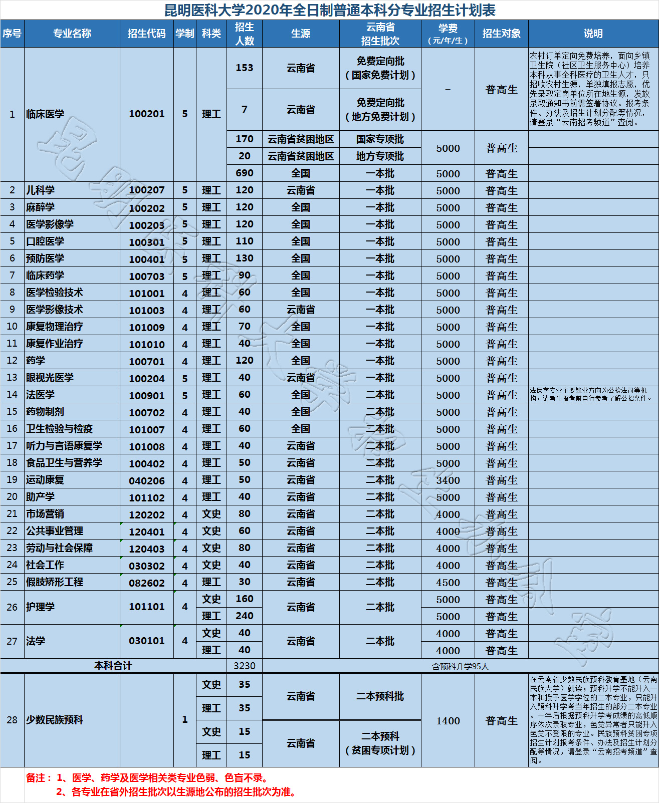 昆明醫科大學2020年本科招生計劃