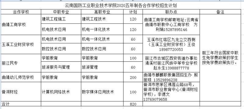 云南國防工業職業技術學院2020五年制各合作學校招生計劃