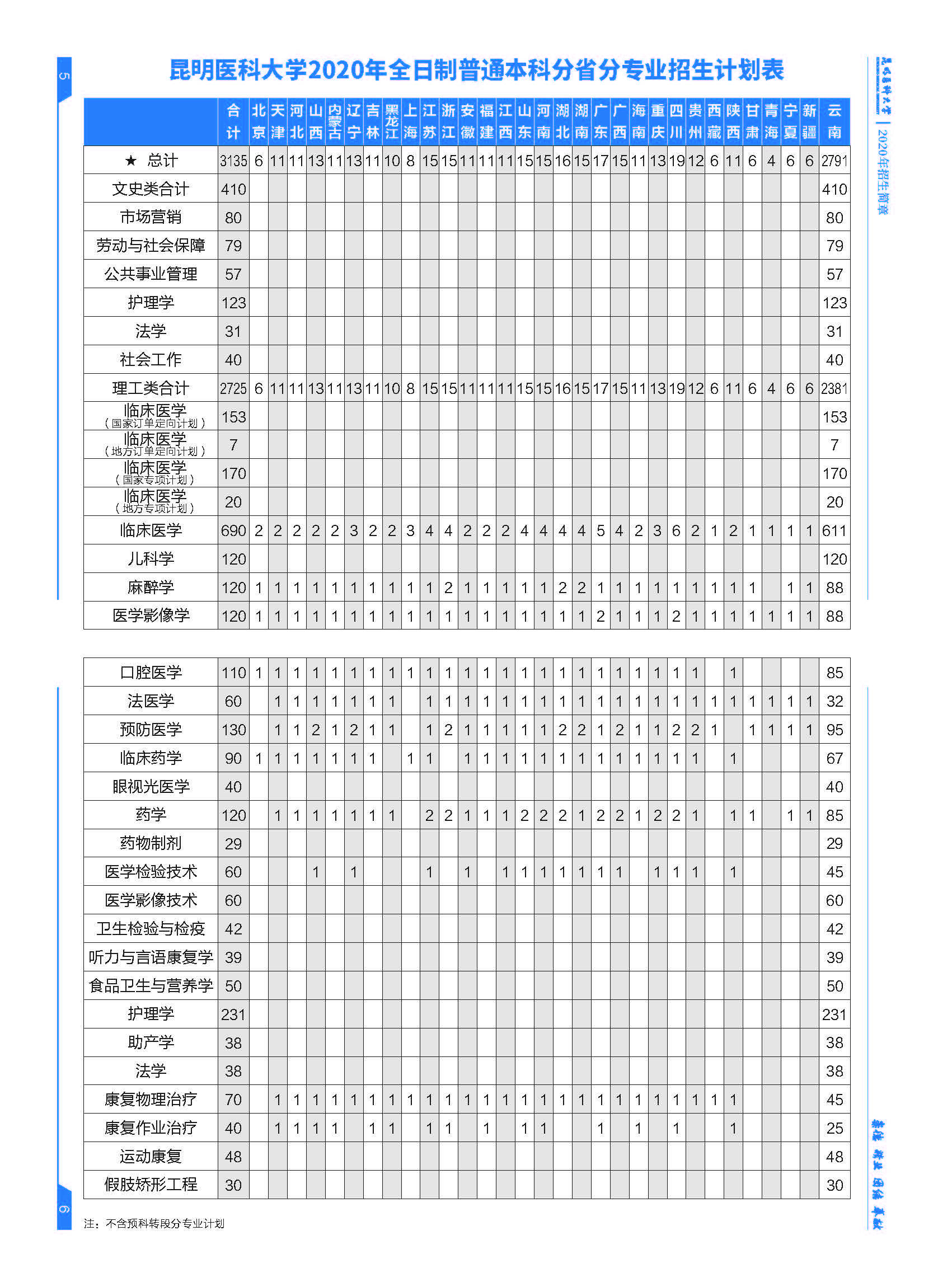 昆明醫(yī)科大學(xué)2020年全日制普通本科分省分專業(yè)招生計(jì)劃表
