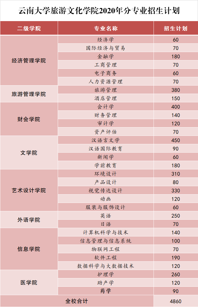 云南大學旅游文化學院2020年分省分專業招生計劃(點擊在線瀏覽)