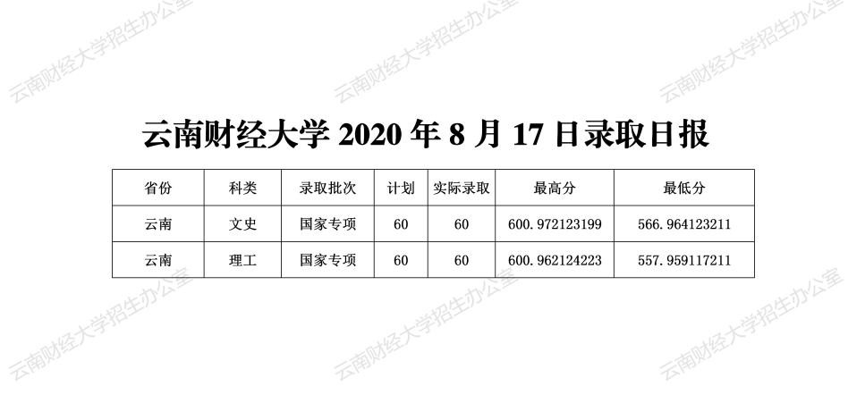 云南財經大學2020年8月17日錄取日報