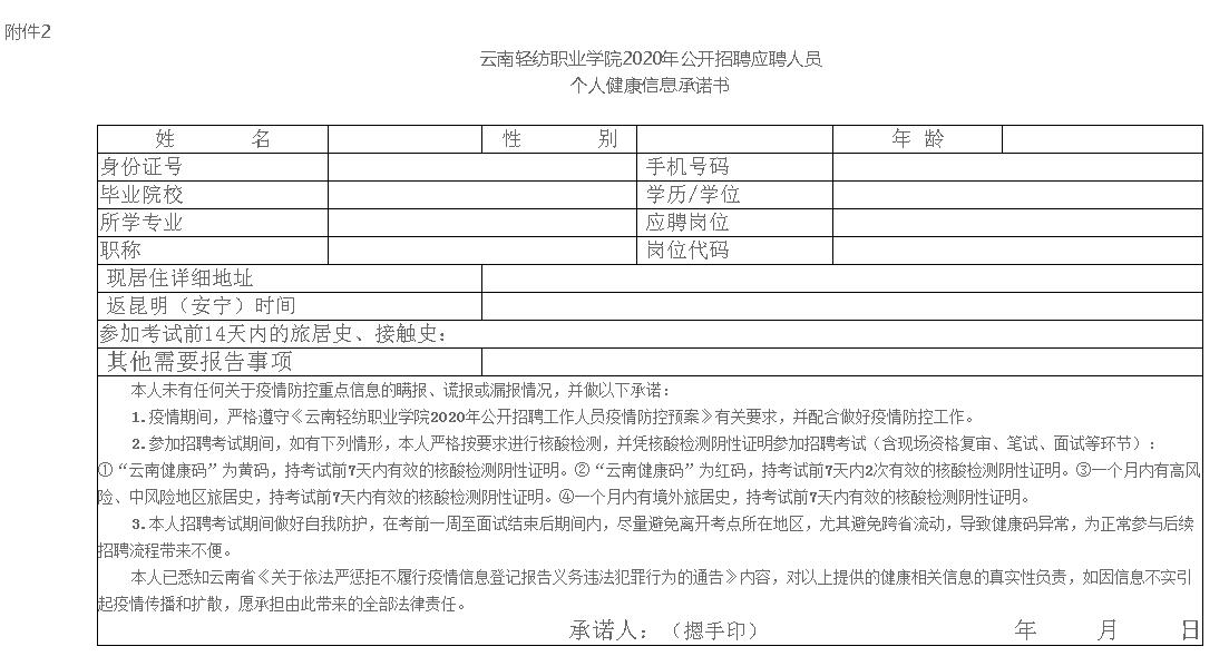 2.云南輕紡職業(yè)學(xué)院2020年公開招聘應(yīng)聘人員個(gè)人健康信息承諾書