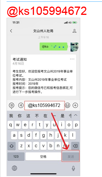 第二步:請將下方@KS和9位數據組成的紅色的“驗證字符串”(大小寫均可,每位考生驗證字符串均不同),發送到文山州人社局微信公眾號,發送方法見下圖所示.