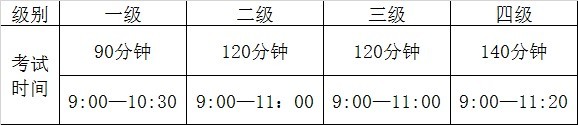 一級(jí)B:3分鐘/1名考生;一級(jí):8分鐘/2名考生;二級(jí):10分鐘/2名考生;三級(jí):10分鐘/2名考生;四級(jí):12分鐘/2名考生。